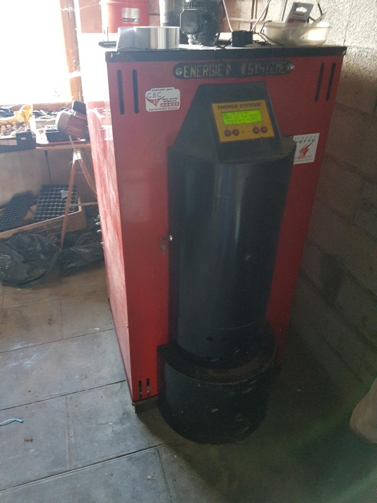 Installation d'une chaudière multi combustibles ENERGIE SYSTEM. Accès au silo directement à travers le mur de la maison.