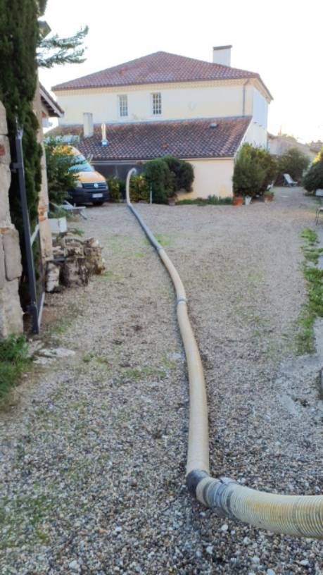 Pour cette livraison, notre chauffeur-livreur a dû raccorder trois flexibles et une rallonge afin de couvrir la distance entre le camion souffleur et le silo de stockage.