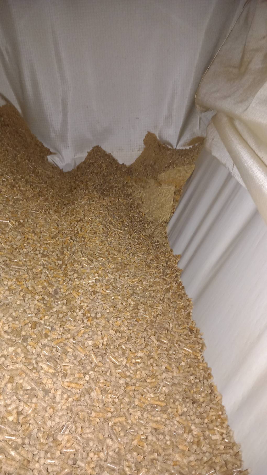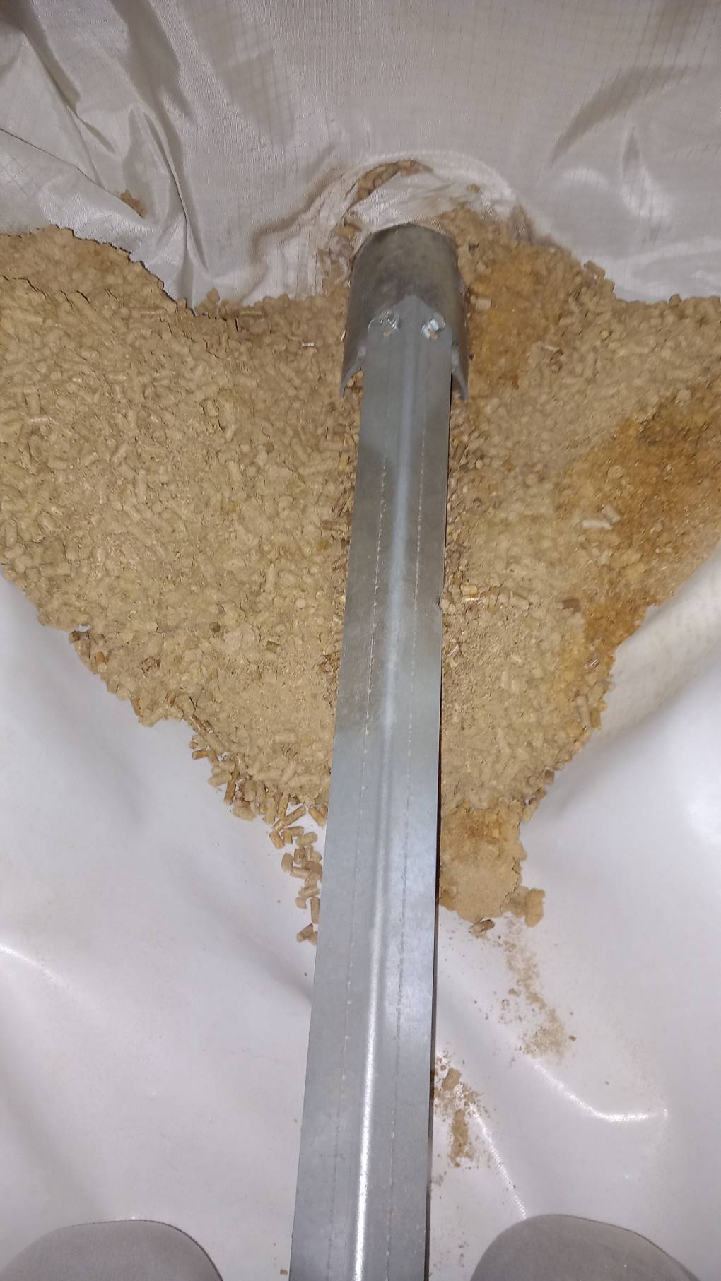 À la demande de son installateur, elle nous a donc contactés pour procéder au nettoyage de son silo, impliquant l’extraction d’environ deux tonnes de granulés. Lors de notre intervention, nous avons rapidement identifié l’origine réelle de son problème : des blocs de granulés décomposés par l’humidité puis recompactés obstruaient la vis sans fin. Il ne s’agissait donc pas d’un simple excès de poussière — même si celle-ci était présente en quantité — mais bien d’un dégât des eaux ayant contaminé une partie du stockage.