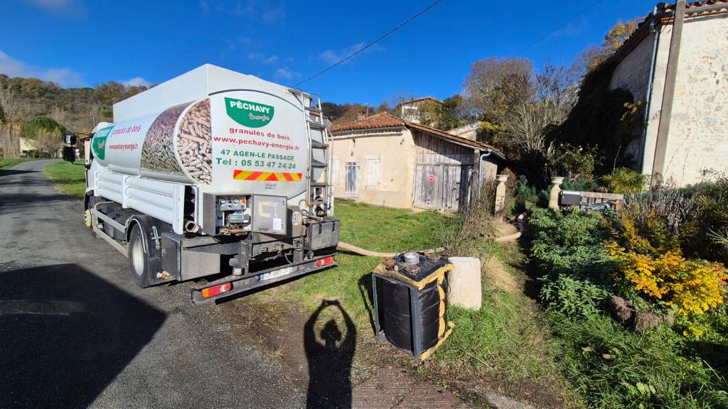 À Saint-Jean-de-Thurac, dans le Lot-et-Garonne (47), un tout nouveau client vient de recevoir sa première livraison de pellets premium en vrac grâce au savoir-faire de notre entreprise Péchavy Énergie Bois.
