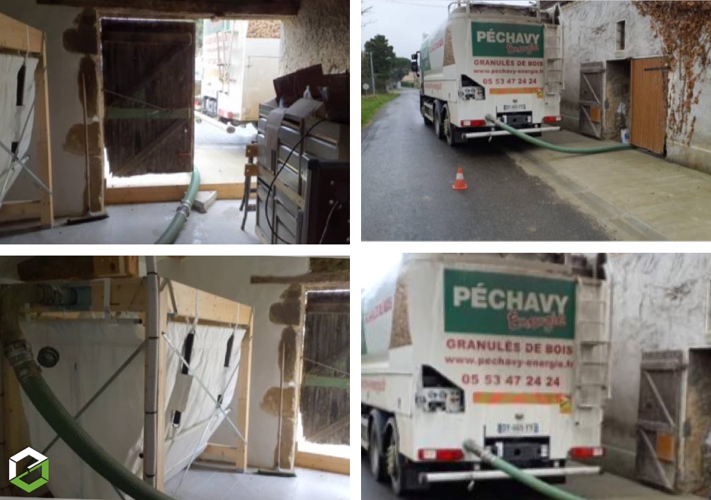 Lors de cette intervention, 3,5 tonnes de granulés de bois premium ont été livrées à l’aide d’un camion souffleur équipé d’une pesée embarquée. Ce système assure une traçabilité précise des quantités livrées grâce à un ticket de pesée. Le camion est également doté d’un aspirateur autonome de fines, permettant de limiter la présence de poussières issues du soufflage. Le soufflage des pellets est réalisé dans des conditions optimales grâce à deux flexibles raccordés entre le camion et le silo, assurant une circulation fluide de ces derniers. La pression de soufflage inférieure à 0,5 bar, réduit considérablement les risques de brisures et la production de fines.