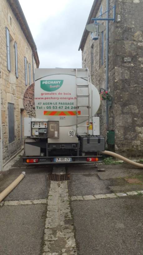 La livraison a été effectuée à l’aide d’un petit camion-souffleur d’une capacité de 11 tonnes, spécialement sélectionné pour intervenir dans les zones à accès restreint ; comme dans cette petite rue étroite très rurale de Sérignac dans le département du Lot (46).