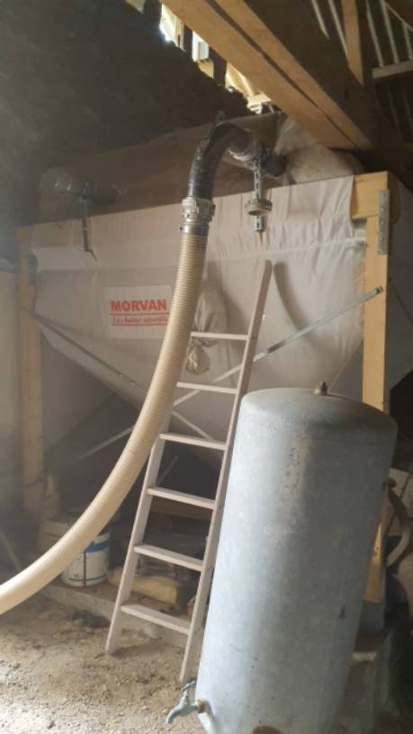 L’installation du client repose sur un silo textile d’une capacité de 5,5 tonnes, parfaitement dimensionné pour assurer une autonomie confortable sur la saison de chauffe. Ce silo alimente une chaudière à granulés de bois Morvan, reconnue pour sa compatibilité avec nos granulés de bois PECHAVY certifiés DIN+ et EN+.