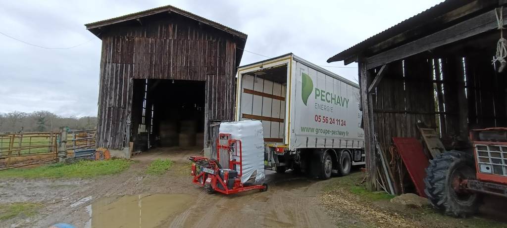 Pour cette livraison à Bassens, Péchavy Énergie Bois a mobilisé un camion-porteur équipé d’un chariot embarqué ainsi que d’un transpalette électrique. Ce dispositif permet de déposer la palette de granulés de bois au plus près du lieu de stockage, même dans les accès complexes.