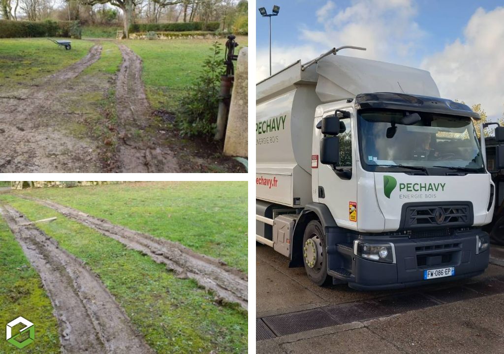Dans ce cas précis, comme en témoignent les photos, nous n'avions pas d'autre choix que d'intervenir en plein hiver, la cliente étant en panne de combustible. La distance entre le portail d'entrée et le silo de stockage étant supérieure à 60 mètres, nous avons dû rapprocher le camion au plus près de l'habitation. Malgré tout le soin apporté par notre chauffeur-livreur, le passage du véhicule a inévitablement laissé des traces sur le terrain.
