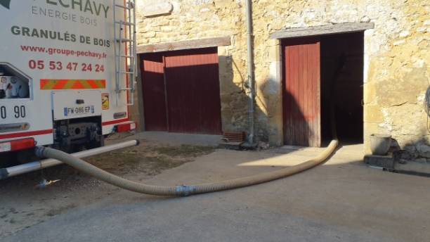 La livraison a été assurée par nos camions-souffleurs équipés de pesée embarquée et d’un aspirateur autonome de fines. Pour raccorder le camion Péchavy au silo textile, une installation technique a été mise en place. Le chauffeur a utilisé 1 coude et 3 flexibles pour le transfert des granulés de bois en vrac au moment du soufflage.