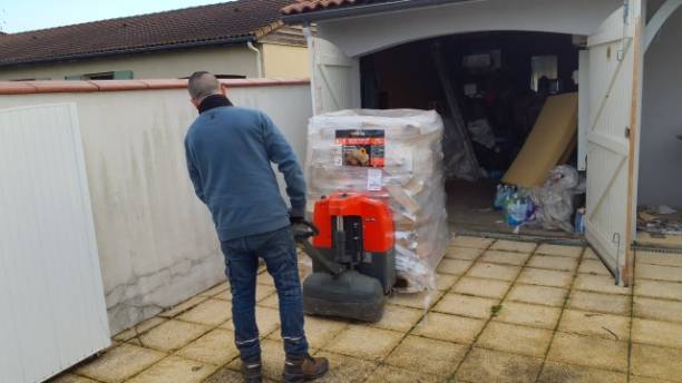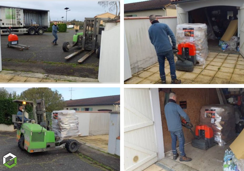La livraison est réalisée par camion porteur équipé d’un chariot embarqué et d’un transpalette électrique, permettant de déposer le ballot de bois au plus près de la zone de stockage (garage, abri, etc).