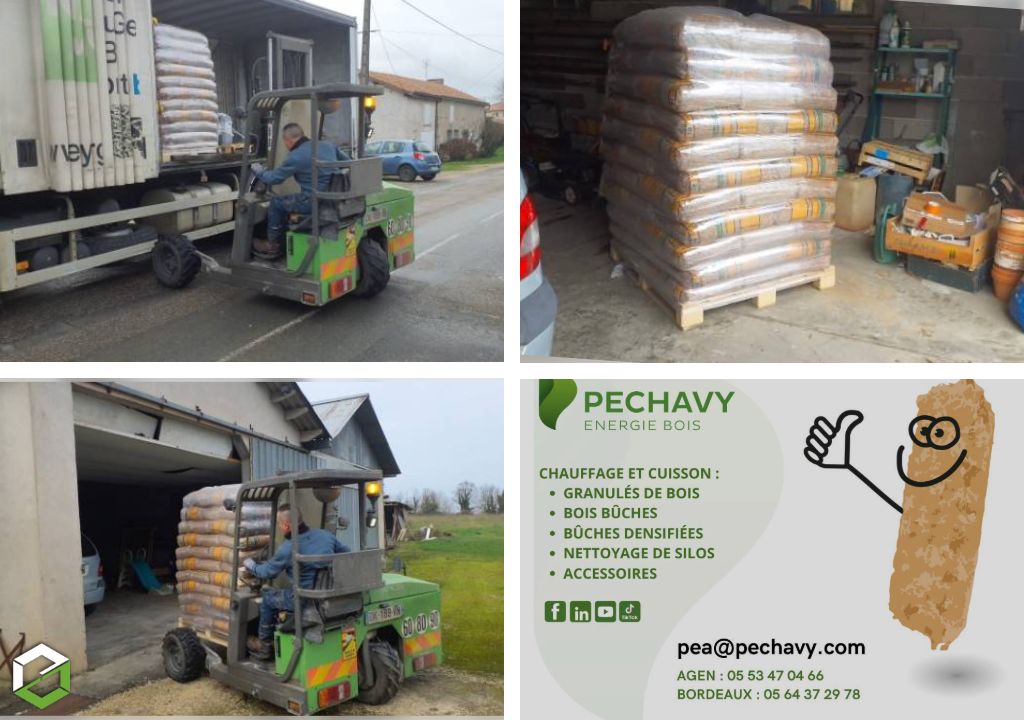 Depuis 2006, Péchavy Energie Bois accompagne les particuliers et professionnels du Sud-Ouest avec un service de livraison de granulés de bois en vrac et en sacs. Retour sur une livraison à Villeneuve-sur-Lot d’une palette de granulés de bois Hà Lègne Orange Péchavy.