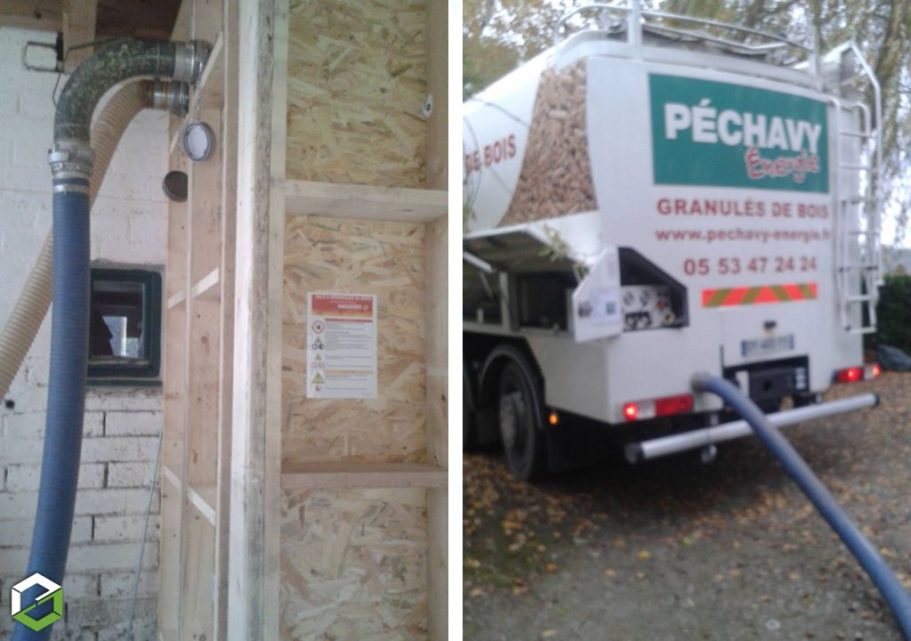 La livraison de granulés de bois en vrac est effectuée par camion souffleur avec pesée embarquée et aspirateur autonome de poussières. Le camion est relié au silo via des flexibles de soufflage assemblés le plus linéairement possible.