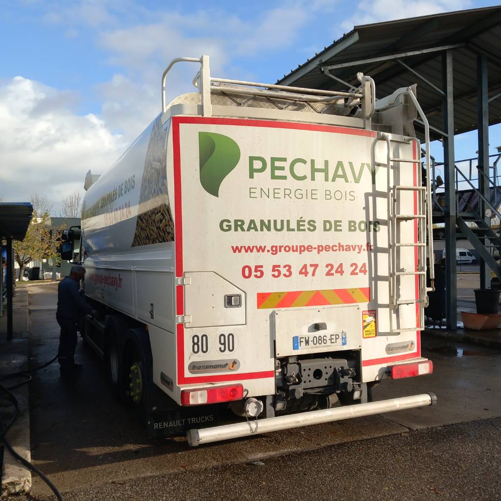 Pour ce 1er remplissage du silo de stockage à granulés de bois, Péchavy Énergie Bois a mobilisé un camion souffleur équipé :