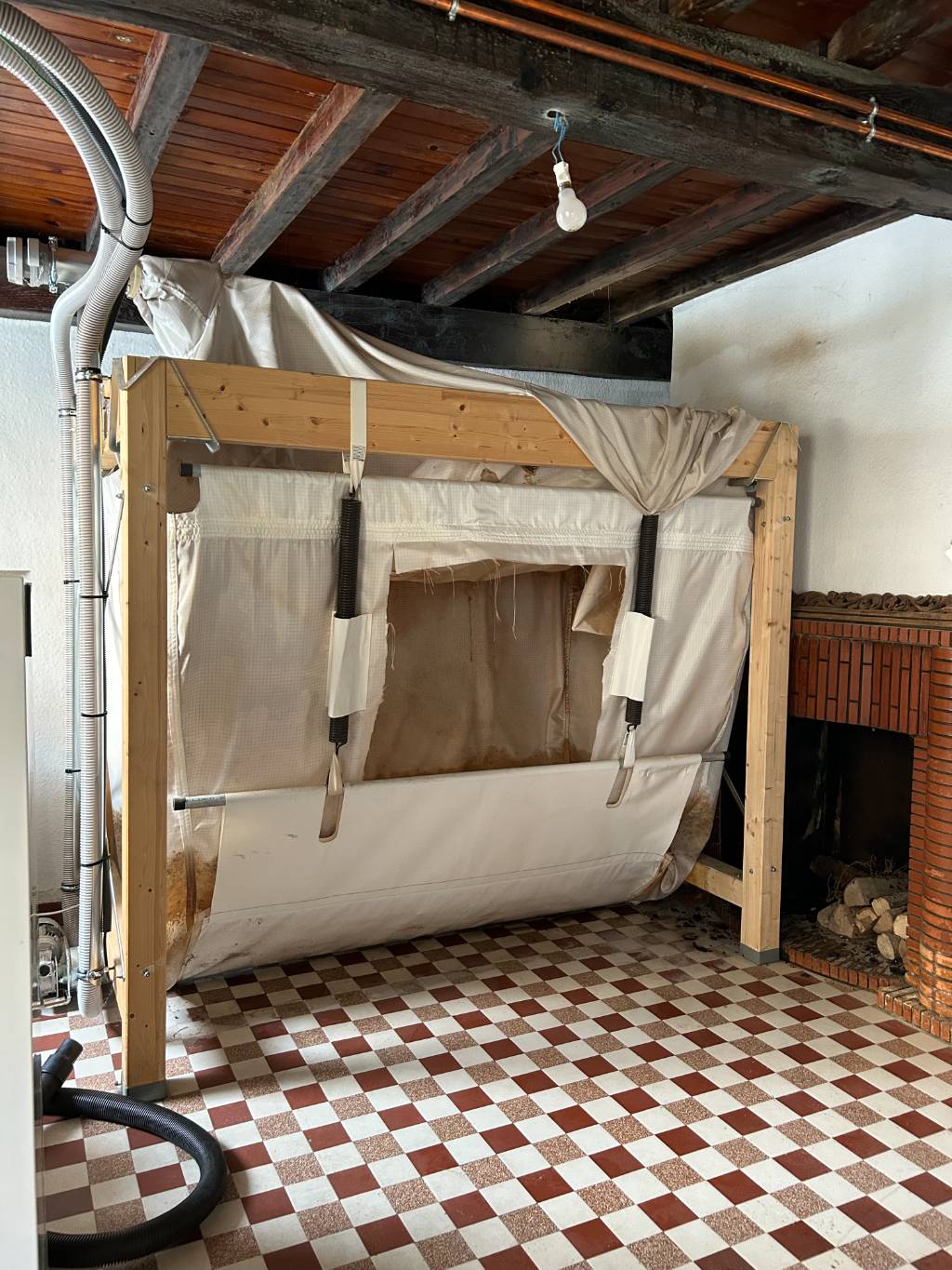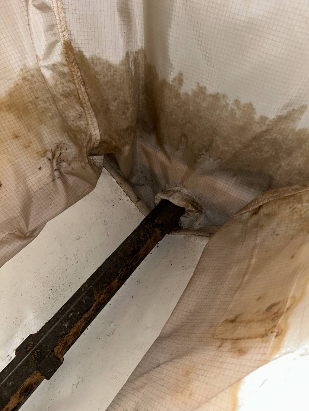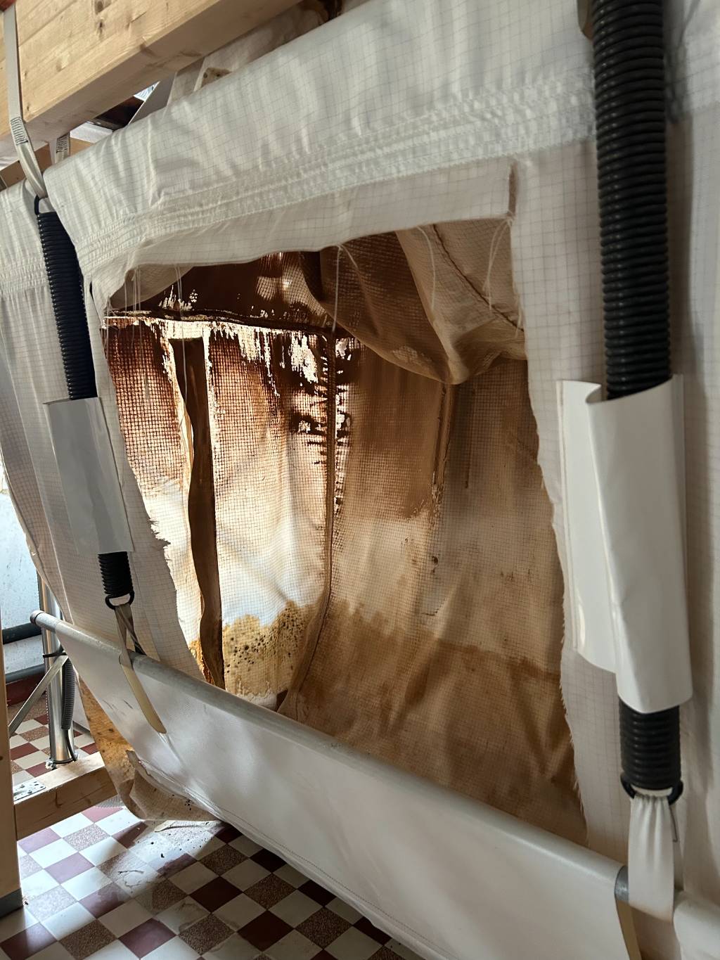 Suite à la rupture d'un tuyau dans les combles, un dégât des eaux a gravement endommagé le silo textile de stockage de granulés de bois d'une cliente à Auros, en Gironde. L'humidité a rapidement détérioré les granulés de bois stockés dans le silo de stockage, rendant l'installation totalement hors service.