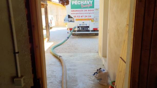 Au programme : 3 tonnes de pellets en vrac Péchavy acheminées directement dans un silo bâti, pour alimenter sa chaudière Froling.