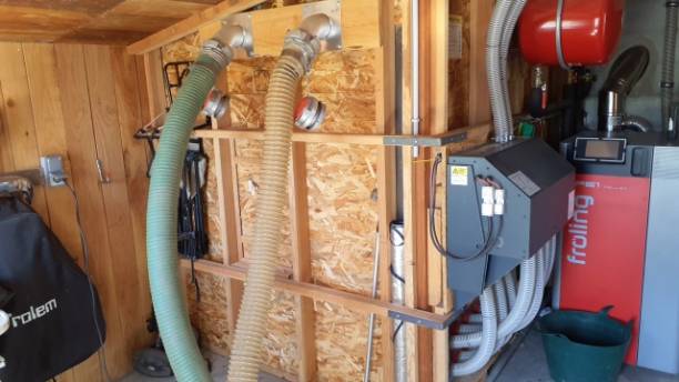 4 : Arrivée en chaudière. Via des tuyaux reliés au collecteur, les pellets rejoignent la chaudière Froling pour une combustion optimale et continue.