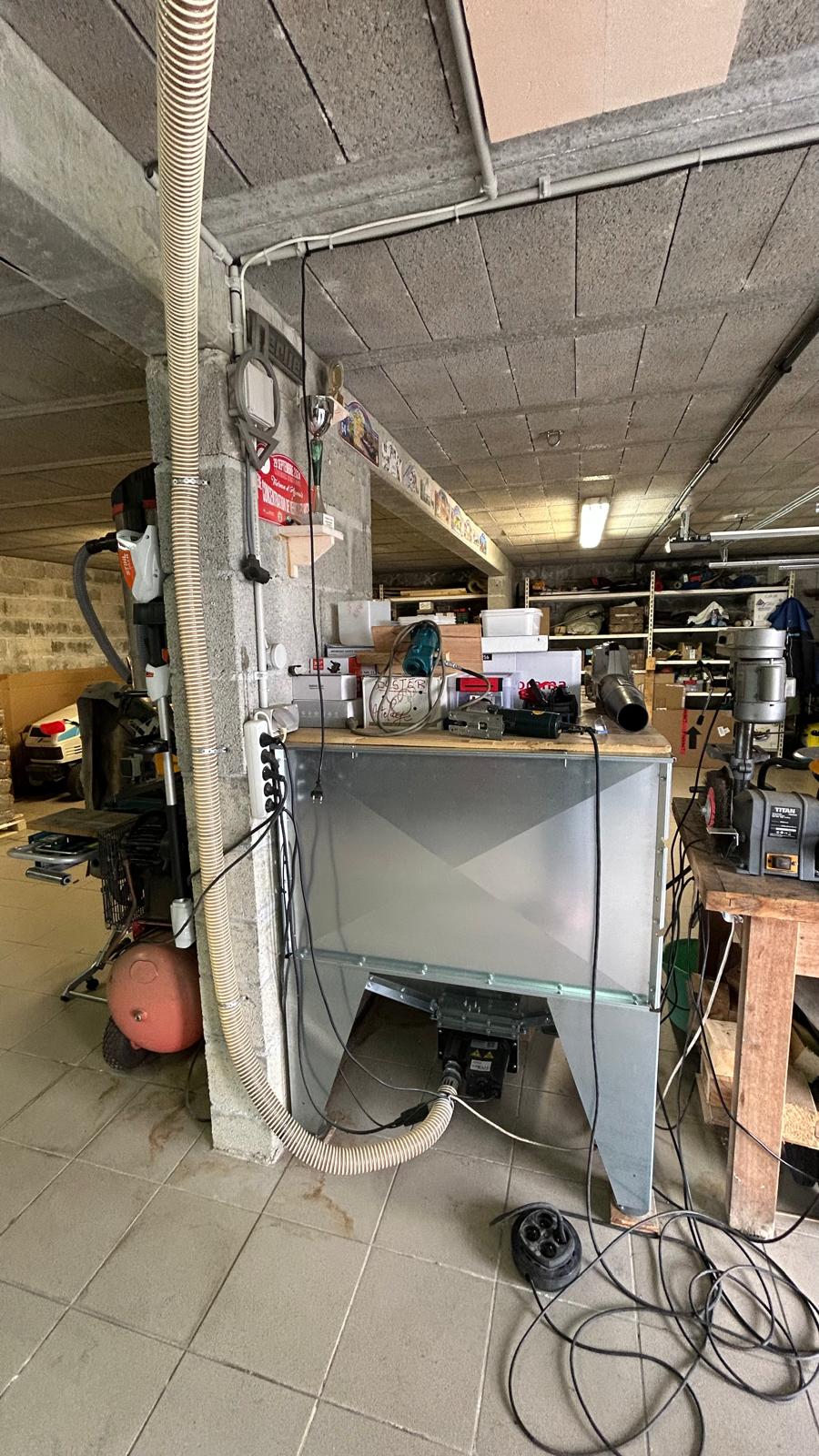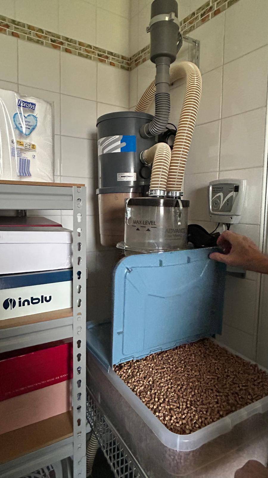 Le client a conçu et installé un système de stockage de granulés de bois en rez-de-chaussée, équipé d'un dispositif d'aspiration qui achemine automatiquement les granulés jusqu'au poêle MCZ situé au premier étage. Résultat : une fois les sacs rangés dans le garage, plus besoin de porter quoi que ce soit à l’étage.